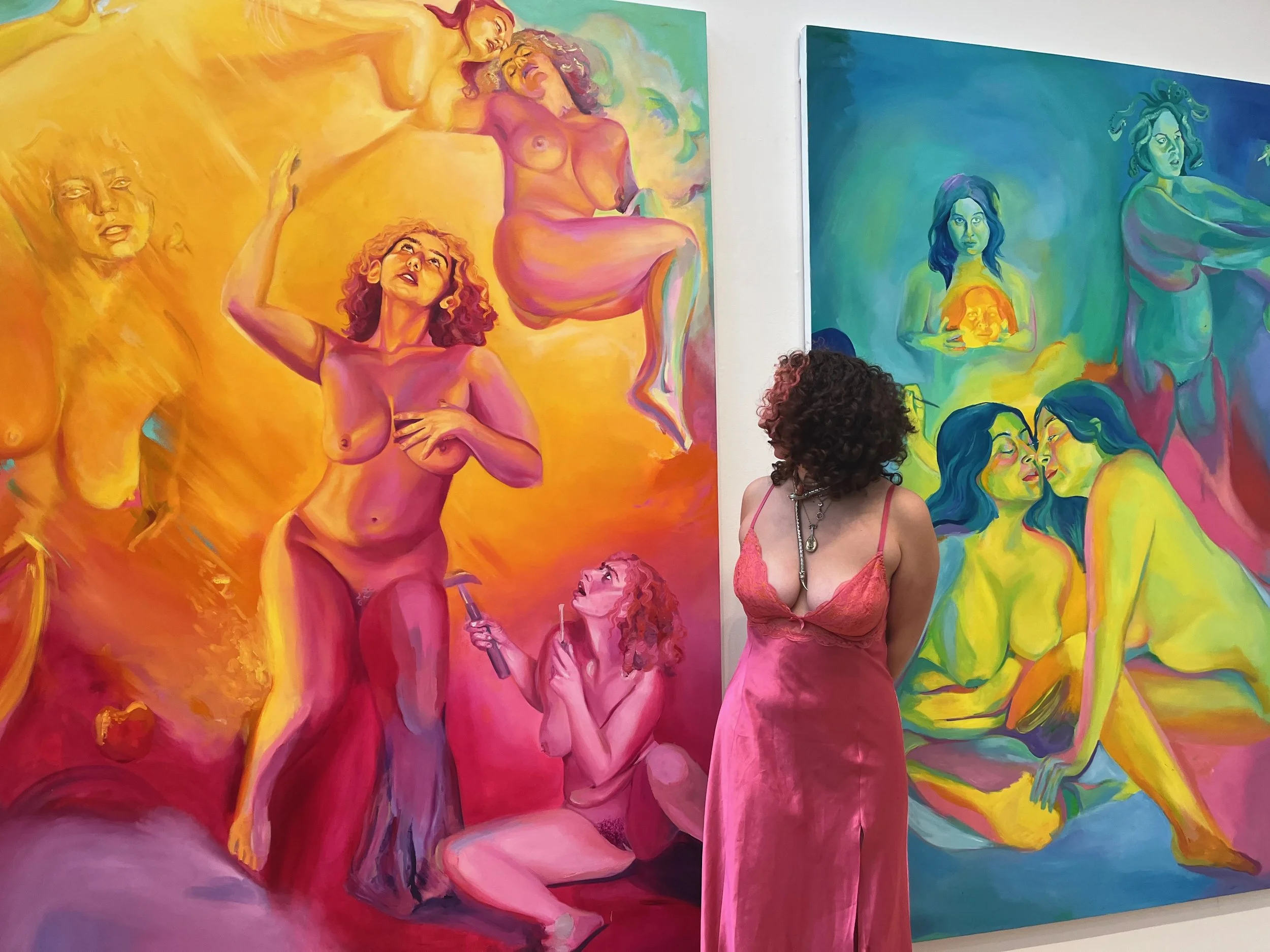 As an artist, I explore themes of queer intimacy and the creation of the self. The beauty of queerness is being able to connect with oneself enough to be deeply involved in ones own construction and discovery. My work often involves the insertion of many selves making themselves and recreating the genre of history painting into a psychedelic colorful , and throughly queer landscape. At the same time I find myself fascinated with displaying the self in states and acts of creation and dissolution thought the emotive world of the surreal, as inspired by the tradition of surrealists Leonora Carrington and Leonor Fini.